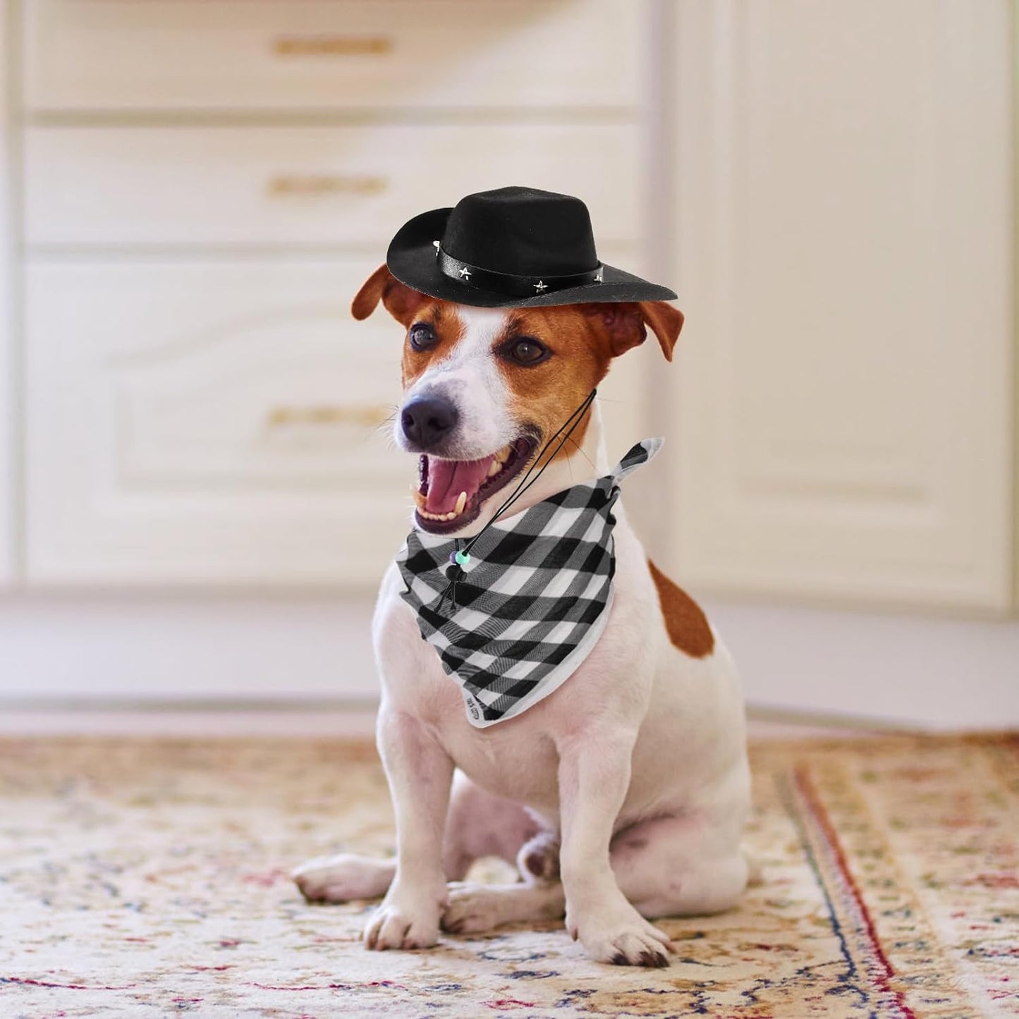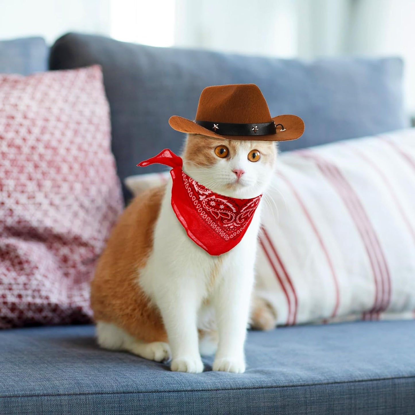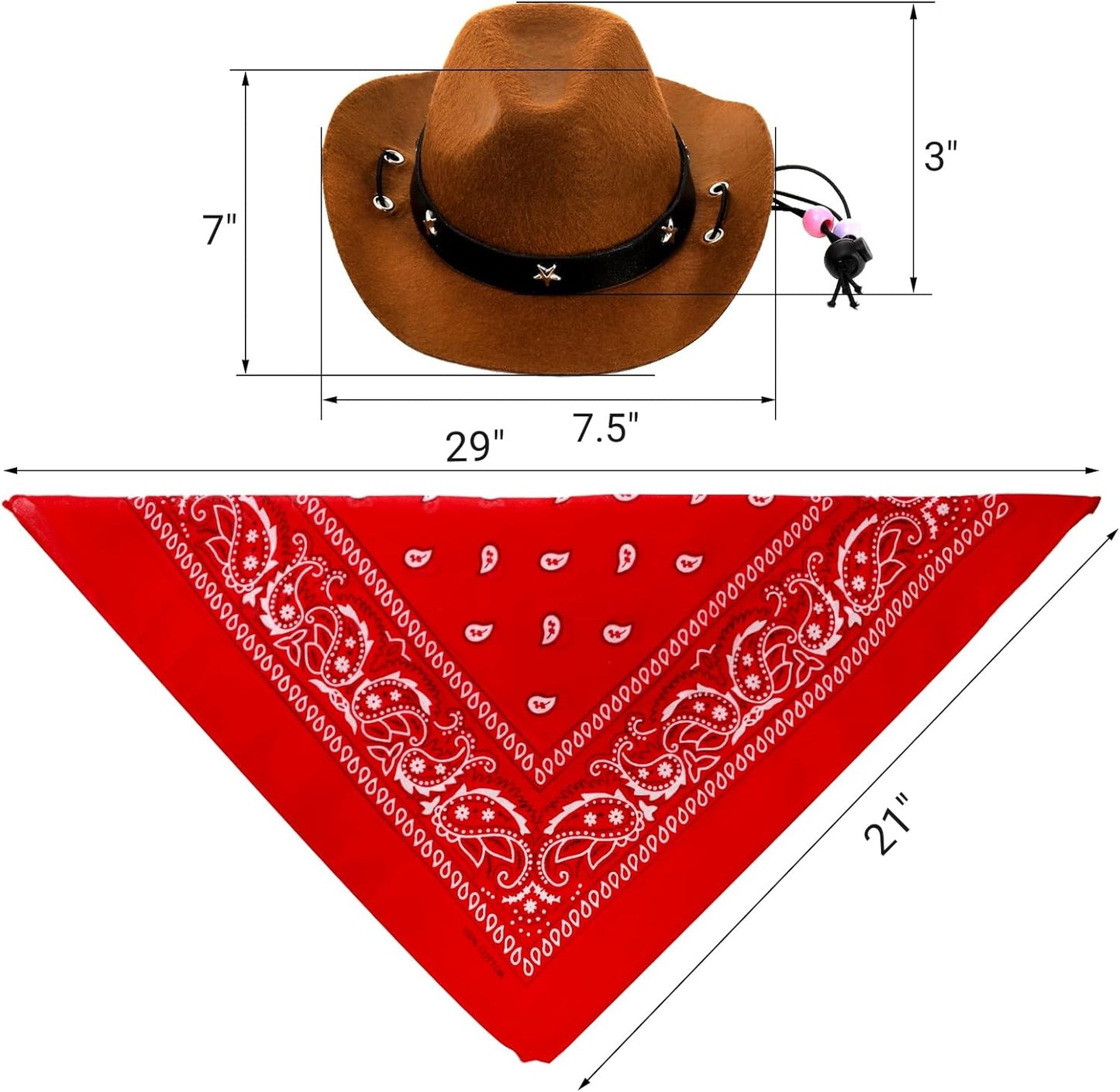 You will get 4 pieces of pet cowboy costume accessories, black and brown cowboy hats, red and white bandana scarfs, which is sufficient to meet your party, festival or daily dressing needs for your cats or small dogs on different occasions. Our cowboy hat with an adjustable chin strap are suitable for most puppies and kittens, measuring 7.7 x 6.5 x 2.7 inch (L x W x D) and 4.8 x 4inch (L x W) in head circumference. The bandana scarf measures 21 x 21 inch. Our west cowboy accessories are designed with retro style and western-themed look, which are great cosplay party costume accessories and funny decorations for your pet, leaving you and your pet wonderful costume memories. Our cowboy hats are made of high-quality polyester, which are light, skin-friendly and comfortable. They are also durable, not easy to fade and tear. Our west cowboy party cosplay wearings are ideal for pet festival, Halloween Christmas, Holidays, birthday, costume party, theme party, photo prop, or daily occasion. They are lovely gifts not only for your small dogs and cats, but also for your family members or friends who keep pets like kitten and puppy.