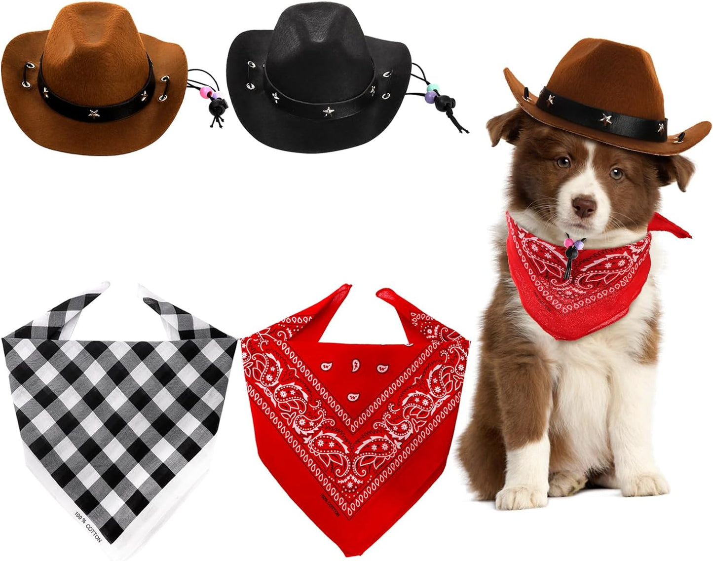 4 Pack Pet Cowboy Costume Accessories Set, 2 Pcs Cowboy Hat and 2 Pcs Bandana Scarf, Puppy Kitten Halloween Christmas Costume, West Cowboy Accessories Party Cosplay Wearing for Cats Small Dogs
