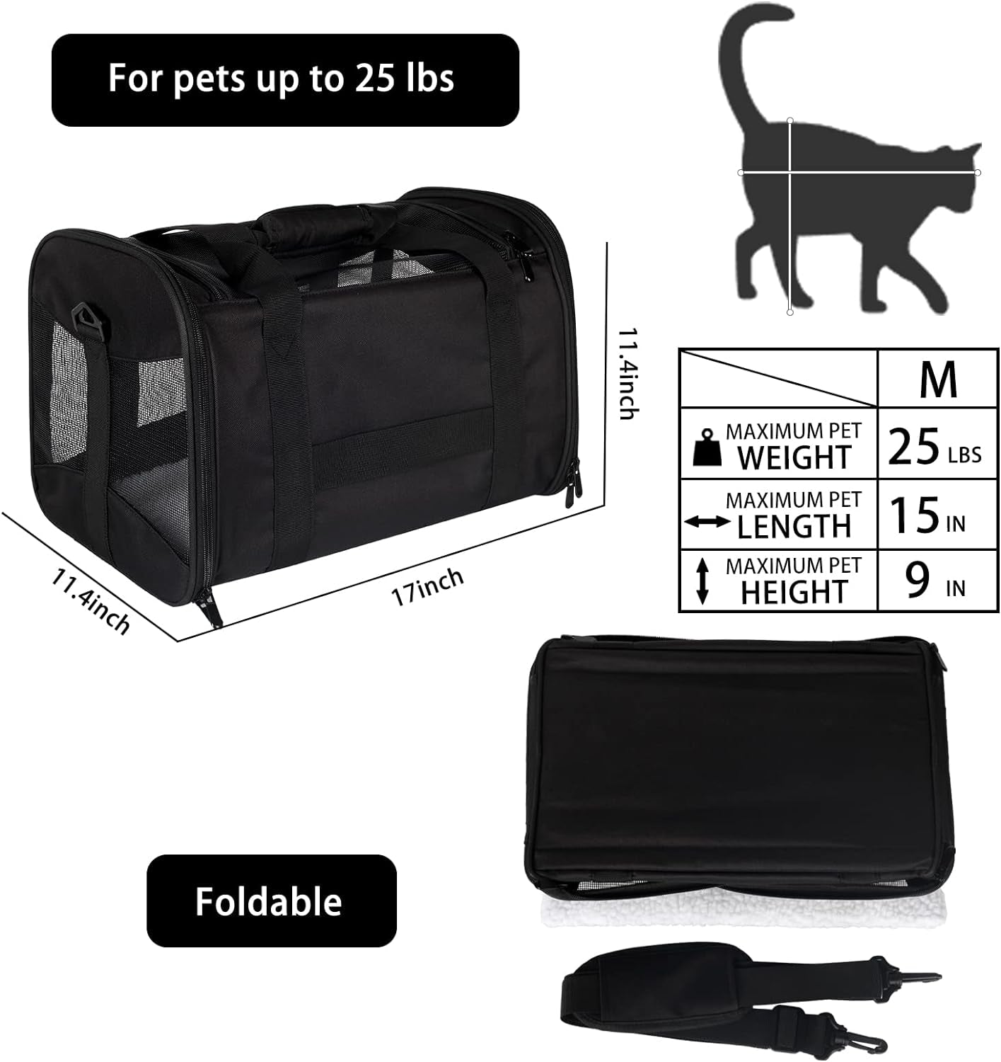 Cat Carrying Case - Pet Carrier Airline Approved, Protable and Breathable Pet Travel Carrier Removable Fleece Pad, Collapsible Cat Carrier Dog Carrier for Medium Cats Small Cats Dogs(Medium, Black)