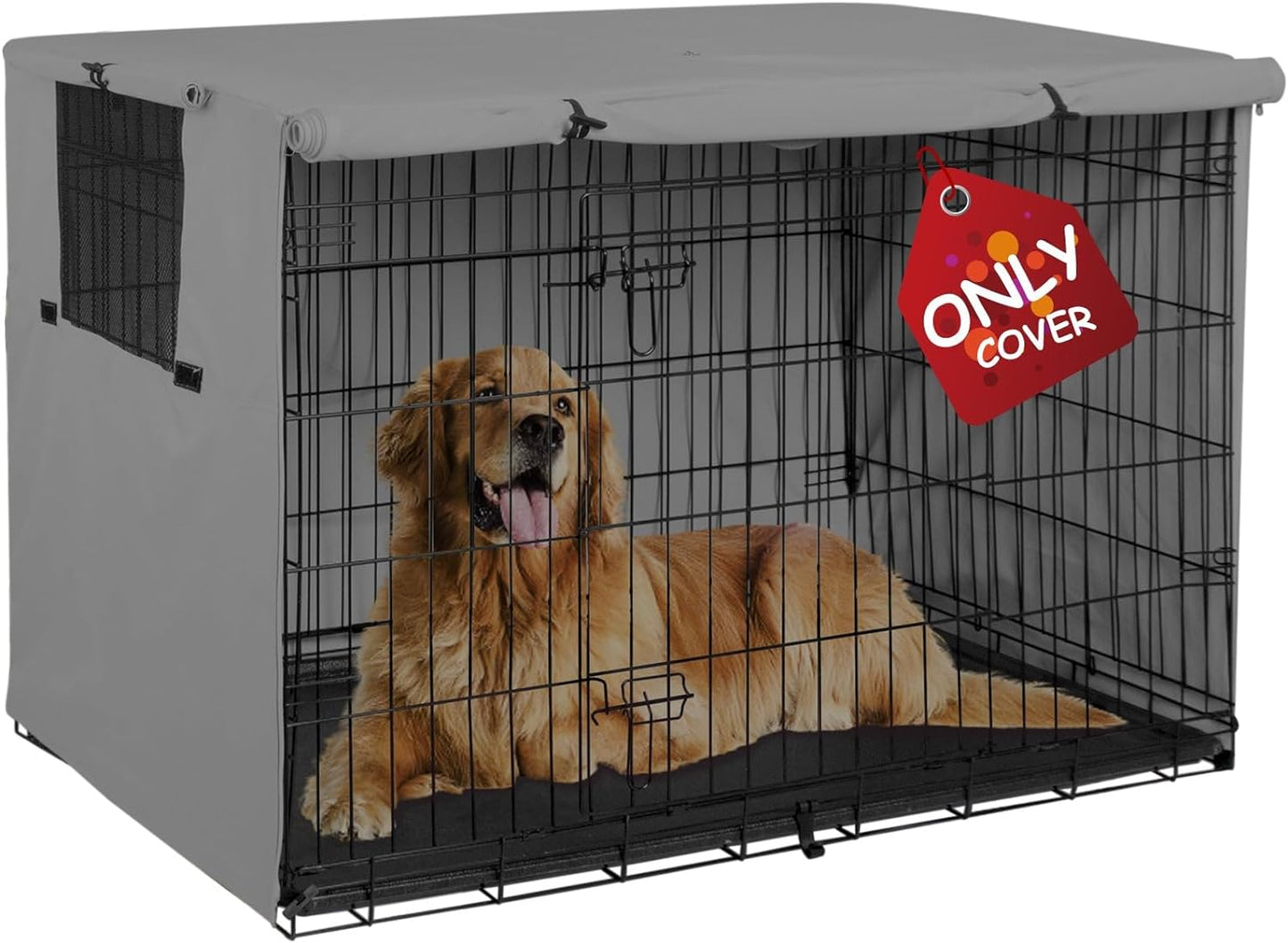 Tip 1. The wire crate is not included and the product is only the cover. 2. Please measure your wire crate size before purchasing. Four toggles on the bottom clips to the cage so it can't blow off in wind, or get taken off some other way. While the entire zipper door closed, the pet crate cover still has a mesh window with roller shades to adjust visibility and ventilation. Plastic toggle locks will secure it within seconds when you roll up the "doors", which is convenient for your pet to get in and get out. Made of durable polyester, stitching is solid, and the zippers are smoothly operating. It's nice that it has a zipper to expose either side door.