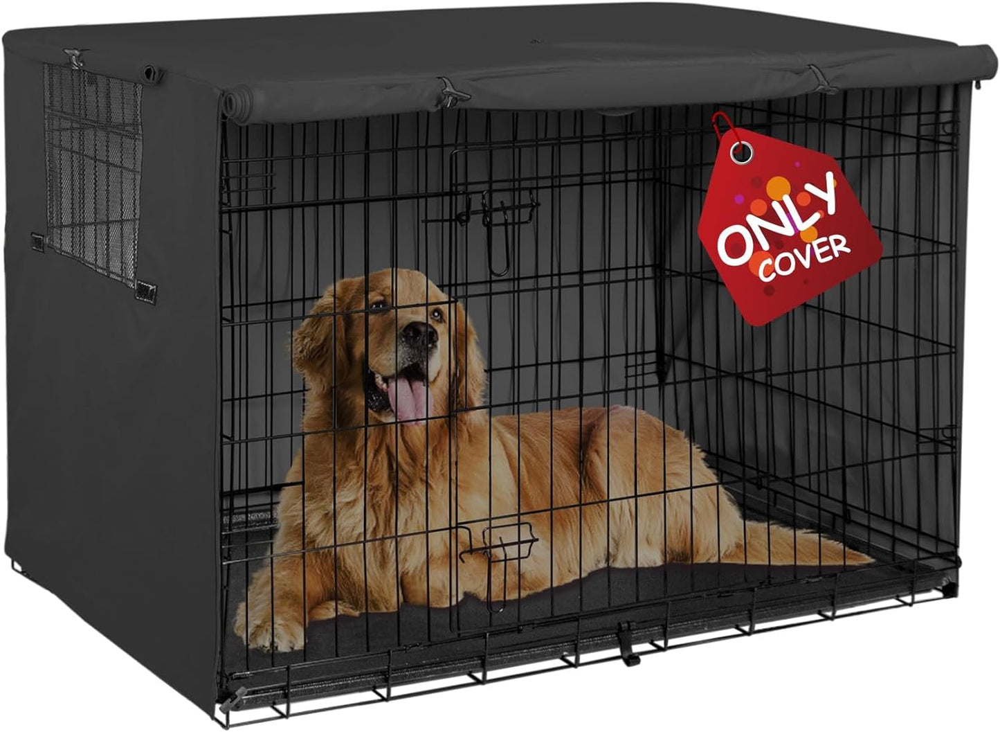 Tip 1. The wire crate is not included and the product is only the cover. 2. Please measure your wire crate size before purchasing. Four toggles on the bottom clips to the cage so it can't blow off in wind, or get taken off some other way. While the entire zipper door closed, the pet crate cover still has a mesh window with roller shades to adjust visibility and ventilation. Plastic toggle locks will secure it within seconds when you roll up the "doors", which is convenient for your pet to get in and get out. Made of durable polyester, stitching is solid, and the zippers are smoothly operating. It's nice that it has a zipper to expose either side door.