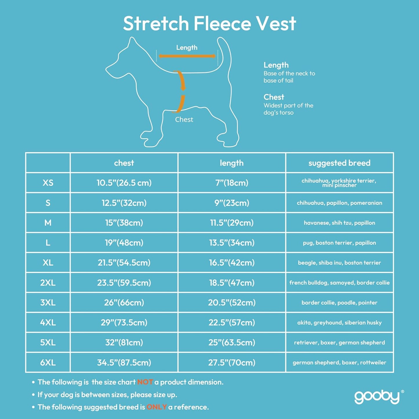 Gooby stretch fleece is perfect for everyday use. Very comfortable and can be worn all day. The Stretchable material is easy to wear and take off. The largest fleece (6XL) can fit a dog up to 80 lbs. Please measure your dog before purchasing.