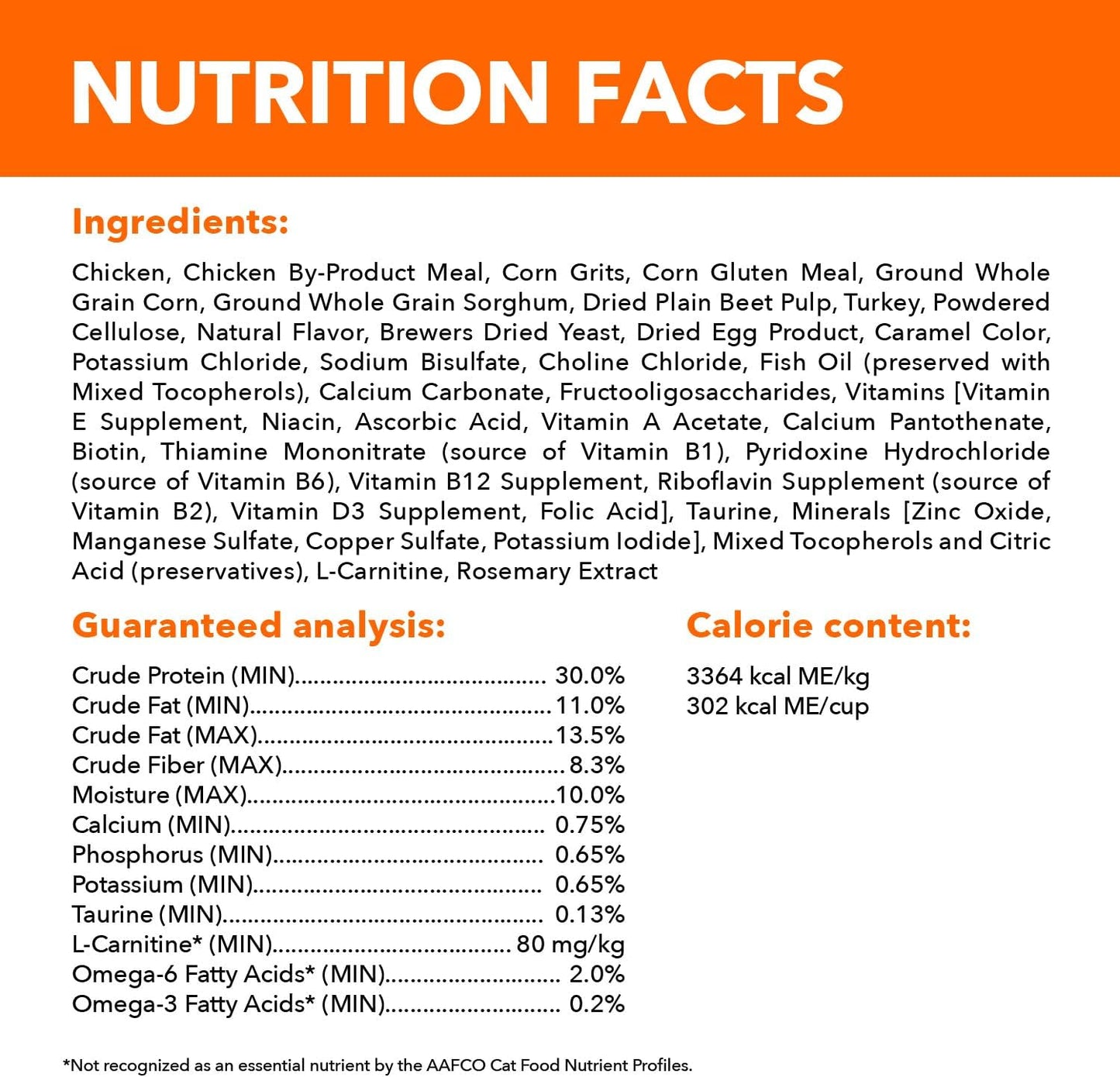 Crafted to support the optimal health of your indoor cat, IAMS PROACTIVE HEALTH Indoor Weight Control & Hairball Care Adult Dry Cat Food with Chicken & Turkey is an everyday meal that’s 100% complete and balanced. This wholesome, tasty recipe is made with real chicken, turkey, and healthy ingredients that provide essential nutrients for your indoor cat. IAMS PROACTIVE HEALTH indoor cat food is formulated with a proprietary fiber blend with beet pulp that helps reduce hairballs before they start, making this the perfect indoor cat food for hairball care. To further support your indoor cat’s health, this kibble is specifically formulated with L-carnitine to help burn fat and maintain a healthy metabolism. Flavorful, nutrient-rich, and formulated for every stage of life, it’s no wonder veterinarians recommend IAMS. Help keep your cat healthy, happy, and playful for life with tailored nutrition from the IAMS brand.