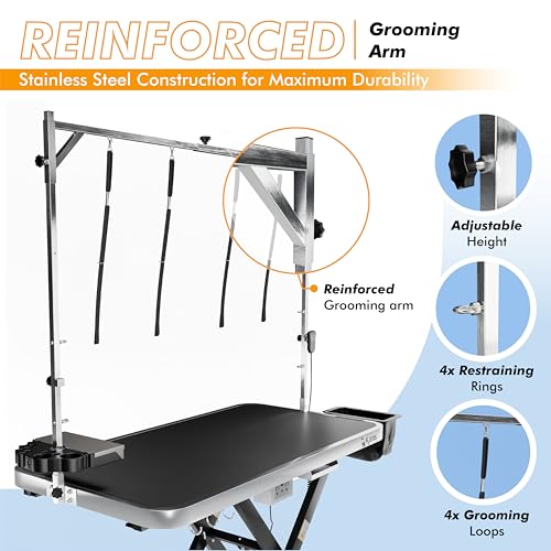 - PRACTICAL DESIGN & ALL ACCESSORIES INCLUDED - Having all your grooming equipment at your hand saves time and makes your grooming area tidy, organized, and always ready for use. The stainless steel frame of the adjustable table coupled with a reinforced grooming arm makes our trimming table stable, secure, and ideal for Commercial Use & Home Grooming.