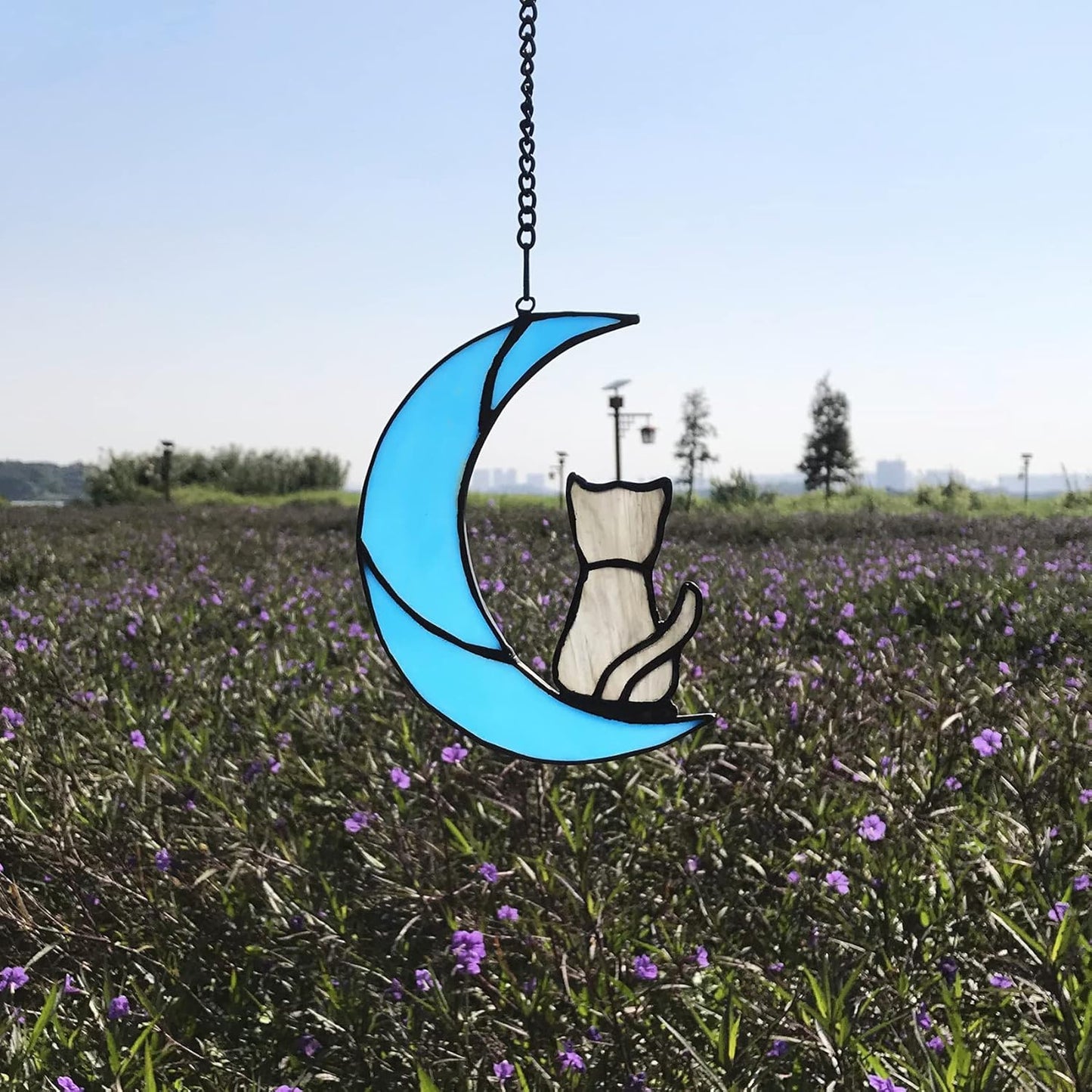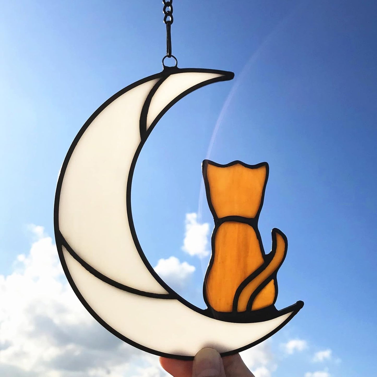 It's perfect cat sympathy gifts when your friend or family loss of beloved fluffy friend. The cute and whimsical design makes them always remembrance the unforgettable times with their pets. This grey cat on blue moon stained glass window hanging is made from several types of stained glass, that different by transparency, texture and shades in the different light. It looks great as cat decor gift. All of my works are handmade. As a result texture of the actual product may be slightly different due to differences in stained glass. Best of all it looks at the window background or at the background of other light source. You can hang it on the window, wall, chandelier, curtains, plants or at any place you want. Colored glass will sparkle in the sun shines, creating a magical atmosphere at your home. This suncatcher can be also used in outdoor decoration. Attention: *It's normal to have bubbles in stained glass. *Smaller sheets of glass may vary depending on what part of the bigger sheet they were cut from, so each stained glass sheet is unique. *Due to the reflection problems or computer setting differences, the slight color deviation is inevitable compared the actual items with images.