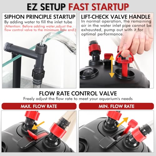 • 【Efficient Filtration Capabilities】 The PondForse canister filter utilizes multiple layers of filtration media to remove particles, excess nutrients, and impurities from the aquarium water. This comprehensive approach to water purification helps maintain crystal-clear water and a healthy ecosystem for your aquatic pets.