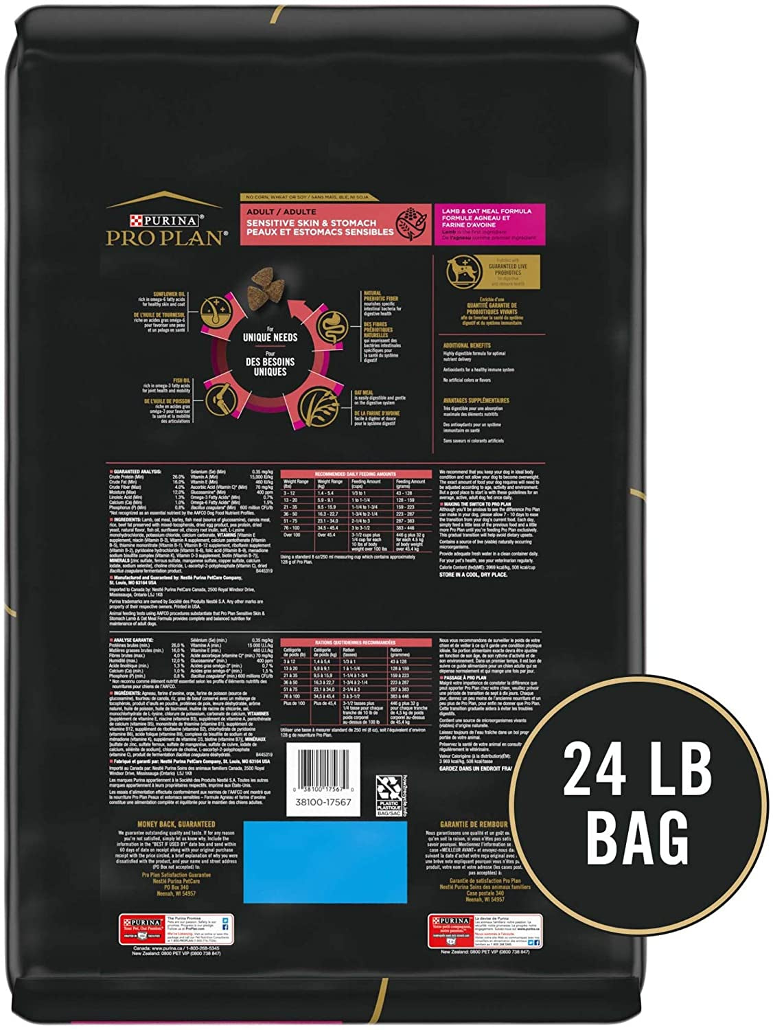 Cater to your dog's sensitive skin and stomach while seeing to his nutritional needs with Purina Pro Plan Brand Dog Food Sensitive Skin and Stomach Lamb and Oat Meal Formula sensitive stomach dog food. This Pro Plan sensitive stomach dog food is made without corn, wheat, soy or poultry by-product meal, giving your dog the wholesome ingredients you expect from a premium dog food. Omega-6 fatty acids and vitamin A in every serving of this sensitive stomach dog food formula nourish your dog's skin and promote his healthy coat so he can look his very best, and omega-3 fatty acids for healthy joints and mobility help support his active lifestyle. With high-quality ingredients chosen for a specific nutritional or functional purpose, this Purina skin and sensitive stomach dog food delivers outstanding nutrition to your dog's bowl every day. Make Purina Pro Plan dry sensitive stomach dog food part of his regular diet, and show him just how important his overall health and wellness are to you.