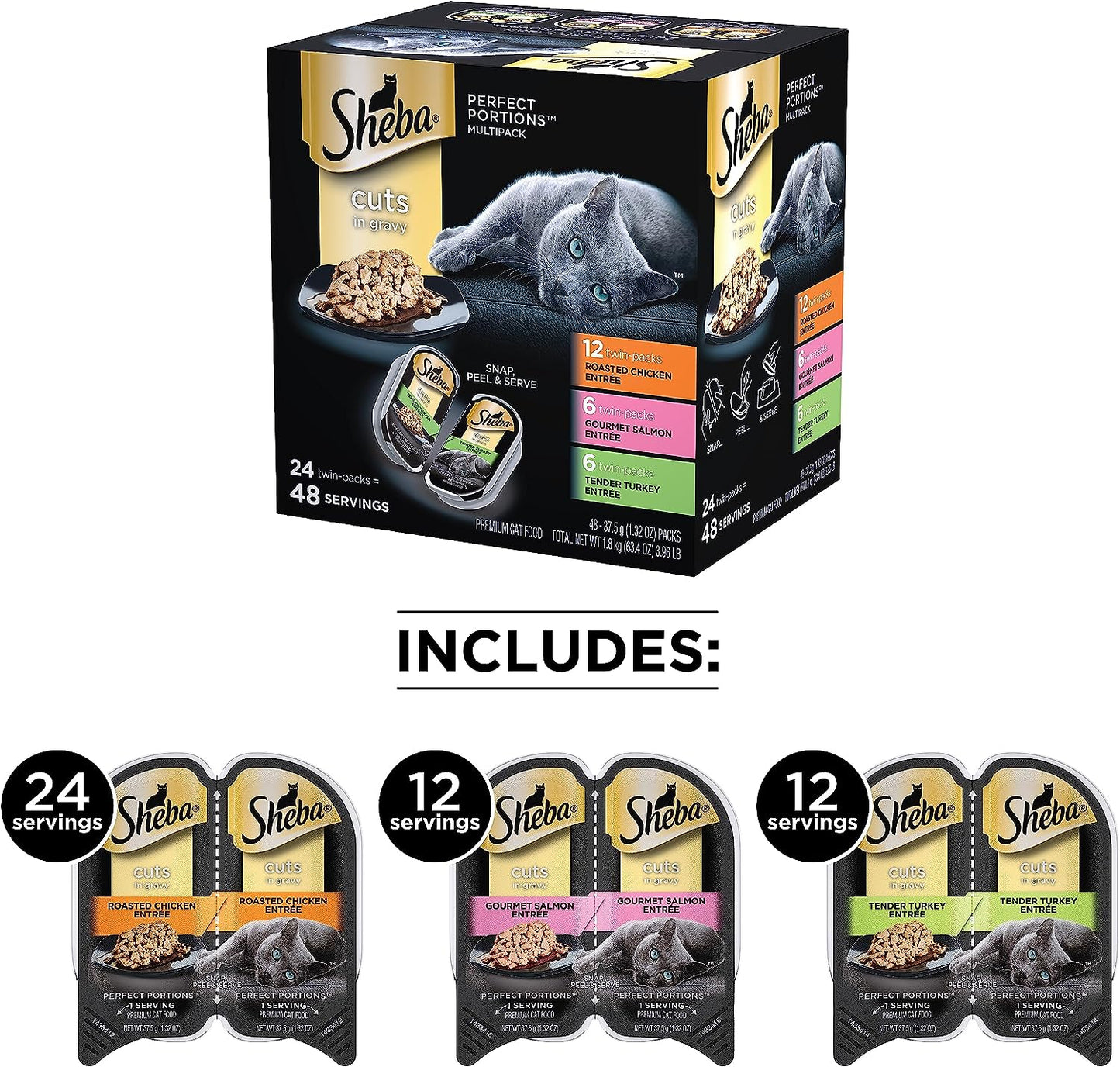• Contains twenty-four (24) 2.6 oz. twin pack trays (48 servings total) of SHEBA PERFECT PORTIONS Cuts in Gravy Wet Cat Food Variety Pack: (12) Roasted Chicken Entrée, (6) Gourmet Salmon Entrée and (6) Tender Turkey Entrée